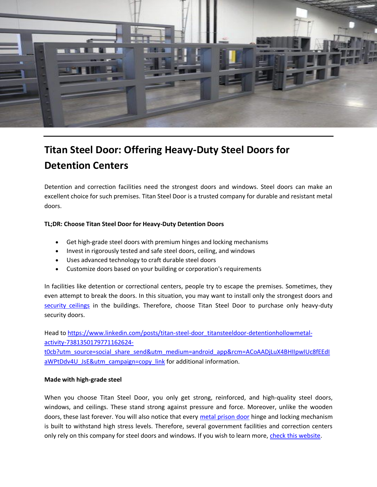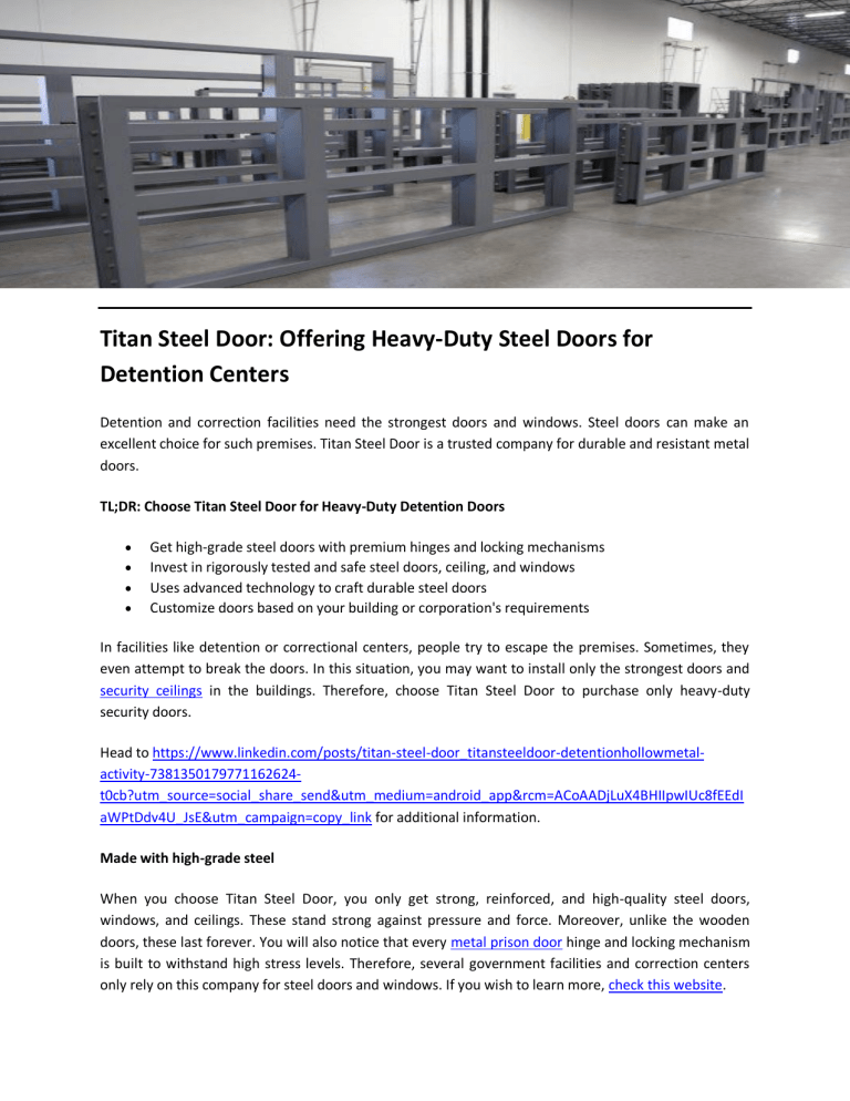 Titan Steel Door: Offering Heavy-Duty Steel Doors for Detention Centers Detention and correction facilities need the strongest doors and windows. Steel doors can make an excellent choice for such premises. Titan Steel Door is a trusted company for durable and resistant metal doors. TL;DR: Choose Titan Steel Door for Heavy-Duty Detention Doors Get high-grade steel doors with premium hinges and locking mechanisms Invest in rigorously tested and safe steel doors, ceiling, and windows Uses advanced technology to craft durable steel doors Customize doors based on your building or corporation's requirements In facilities like detention or correctional centers, people try to escape the premises. Sometimes, they even attempt to break the doors. In this situation, you may want to install only the strongest doors and security ceilings in the buildings. Therefore, choose Titan Steel Door to purchase only heavy-duty security doors. Head to https://www.linkedin.com/posts/titan-steel-door_titansteeldoor-detentionhollowmetalactivity-7381350179771162624t0cb?utm_source=social_share_send&utm_medium=android_app&rcm=ACoAADjLuX4BHIIpwIUc8fEEdI aWPtDdv4U_JsE&utm_campaign=copy_link for additional information. Made with high-grade steel When you choose Titan Steel Door, you only get strong, reinforced, and high-quality steel doors, windows, and ceilings. These stand strong against pressure and force. Moreover, unlike the wooden doors, these last forever. You will also notice that every metal prison door hinge and locking mechanism is built to withstand high stress levels. Therefore, several government facilities and correction centers only rely on this company for steel doors and windows. If you wish to learn more, check this website. Go through a tough testing phase Another reason you may want to invest in Titan Steel Door is that every steel component in this company undergoes rigorous testing. So, without proper testing, it doesn’t release any product in the market. Hence, you will notice that each door and window is highly resistant to corrosion, tampering, and breakage. Therefore, even architects and security professionals admire the strength and reliability factor of these products. Wish to get more details? Get only precise creations The best part about investing in Titan Steel Door is that you get doors and ceilings made using advanced technology. The company follows these criteria to provide you with products of consistent quality. Therefore, when facilities and centers receive the doors and windows, they are always in exact specifications. For instance, the size, hardware, and even finish of every component are up to the mark. Provide you with a customization option Another aspect that makes this company the best choice for detention doors is its customization option. For instance, if you specifically need a soundproof or tamper-proof door, you can request it from the experts. In fact, they sit with you to understand all your requirements before even beginning the manufacturing process. If they have anything similar available in their warehouse, they immediately provide you with the same in no time. So, if you want a concrete steel door that is high-performing and has high mechanical strength, choose Titan Steel Door. You can contact the experts in this company and provide your specifications. Thus, if you need durable detention hollow metal doors and frames for your government or detention facility, contact this company right away. To get more details, visit https://titansteeldoor.com Contact: 770.503.9696 Email: [email protected] Original Source: https://bit.ly/43pw07h
