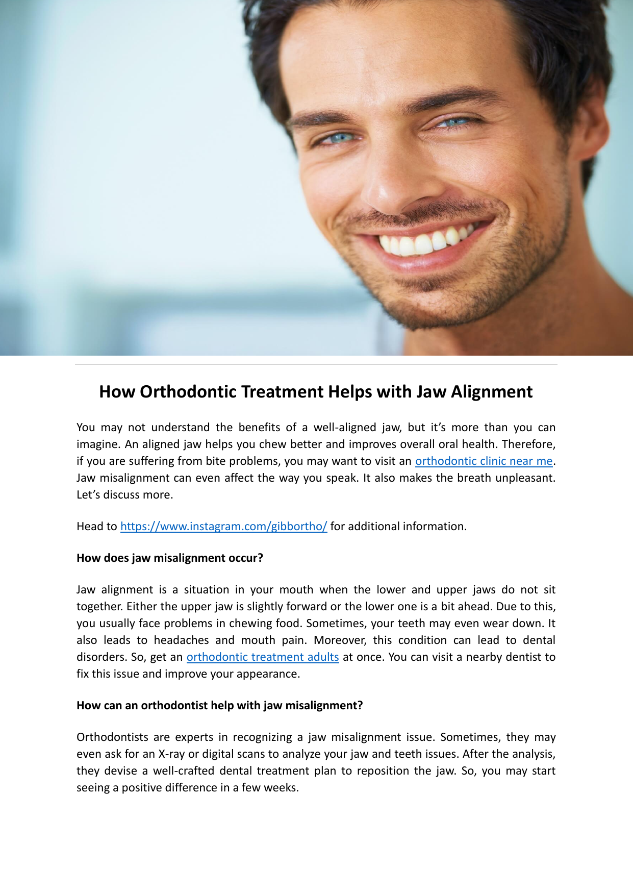 How Orthodontic Treatment Helps with Jaw Alignment You may not understand the benefits of a well-aligned jaw, but it’s more than you can imagine. An aligned jaw helps you chew better and improves overall oral health. Therefore, if you are suffering from bite problems, you may want to visit an orthodontic clinic near me. Jaw misalignment can even affect the way you speak. It also makes the breath unpleasant. Let’s discuss more. Head to https://www.instagram.com/gibbortho/ for additional information. How does jaw misalignment occur? Jaw alignment is a situation in your mouth when the lower and upper jaws do not sit together. Either the upper jaw is slightly forward or the lower one is a bit ahead. Due to this, you usually face problems in chewing food. Sometimes, your teeth may even wear down. It also leads to headaches and mouth pain. Moreover, this condition can lead to dental disorders. So, get an orthodontic treatment adults at once. You can visit a nearby dentist to fix this issue and improve your appearance. How can an orthodontist help with jaw misalignment? Orthodontists are experts in recognizing a jaw misalignment issue. Sometimes, they may even ask for an X-ray or digital scans to analyze your jaw and teeth issues. After the analysis, they devise a well-crafted dental treatment plan to reposition the jaw. So, you may start seeing a positive difference in a few weeks. Additionally, the experts use braces and aligners to align the jaw gently. If you choose aligners or braces, they slowly move the teeth to bring your jaw into a position. This way, you’ll notice a proper improvement in your jaw alignment. Orthodontists may use a functional appliance when a kid or teen requires jaw alignment treatment. As a kid’s jaw is easily movable, a functional device does the job in less time. These devices also guide the jaw’s growth in the right direction. Such devices can also easily mould the jaw to expand or contract as required. Furthermore, a specialist may use rubbers and expanders to correct jaw positions. So, it is wise to visit an expert right away. About Gibb Orthodontics: Gibb Orthodontics has expert surgeons, orthodontists, and the best dentist Lethbridge with a wide knowledge of jaw misalignment. This clinic provides exceptional orthodontic treatments. So, when facing bite problems or overcrowding, check this clinic right away. Expert orthodontists use high-quality equipment and tools to address every dental issue. To get more details, visit https://www.gibborthodontics.com/ Contact Here: (403) 380-4999 Mail: [email protected] Original Source: https://bit.ly/3JYUs9f