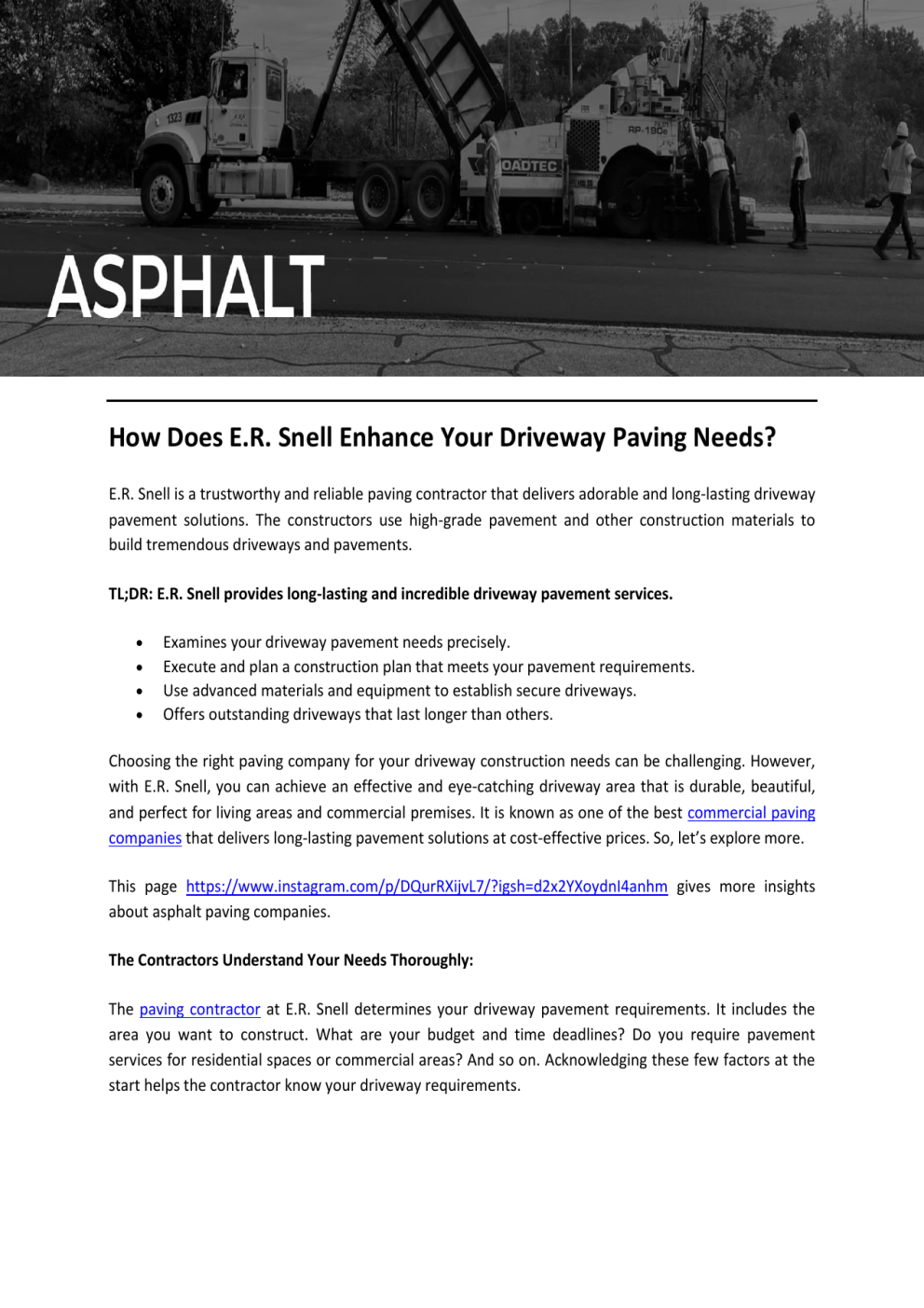 How Does E.R. Snell Enhance Your Driveway Paving Needs? E.R. Snell is a trustworthy and reliable paving contractor that delivers adorable and long-lasting driveway pavement solutions. The constructors use high-grade pavement and other construction materials to build tremendous driveways and pavements. TL;DR: E.R. Snell provides long-lasting and incredible driveway pavement services. Examines your driveway pavement needs precisely. Execute and plan a construction plan that meets your pavement requirements. Use advanced materials and equipment to establish secure driveways. Offers outstanding driveways that last longer than others. Choosing the right paving company for your driveway construction needs can be challenging. However, with E.R. Snell, you can achieve an effective and eye-catching driveway area that is durable, beautiful, and perfect for living areas and commercial premises. It is known as one of the best commercial paving companies that delivers long-lasting pavement solutions at cost-effective prices. So, let’s explore more. This page https://www.instagram.com/p/DQurRXijvL7/?igsh=d2x2YXoydnI4anhm gives more insights about asphalt paving companies. The Contractors Understand Your Needs Thoroughly: The paving contractor at E.R. Snell determines your driveway pavement requirements. It includes the area you want to construct. What are your budget and time deadlines? Do you require pavement services for residential spaces or commercial areas? And so on. Acknowledging these few factors at the start helps the contractor know your driveway requirements. Design Unique Driveway Construction Plan: Once the constructors at E.R. Snell have examined your pavement needs, they design construction plan to fulfil your driveway requirements. This approach contains the designs, safety measures, size of the area, etc. So, you can imagine your driveway's construction plans before their execution and tell them if you require some additional changes. Wish to explore more? Check this page! Use Specialised and Prime Construction Materials: E.R. Snell has a proficient and skilled team of paving experts that uses advanced techniques and highgrade construction material to construct driveways. They bring their best and your vision to life by constructing safe and strong driveway pavement areas. Built Enduring Driveways: Finally, the contractors at E.R. Snell provide you with lifelong and gorgeous driveway pavement solutions. They construct exquisite and superb pavements that enhance the look of your residential and commercial space. Contact the professionals now to gain more insights about asphalt paving solutions! Furthermore, you can find the best positions at E.R. Snell. Whether you’re looking for a water truck driver job or require a position in the corporate field, this company can complete all your job position requirements. To get more information, visit https://www.ersnell.com/. Email: [email protected] Contact: 770.985.0600 Original Source: https://bit.ly/4pyGWrK