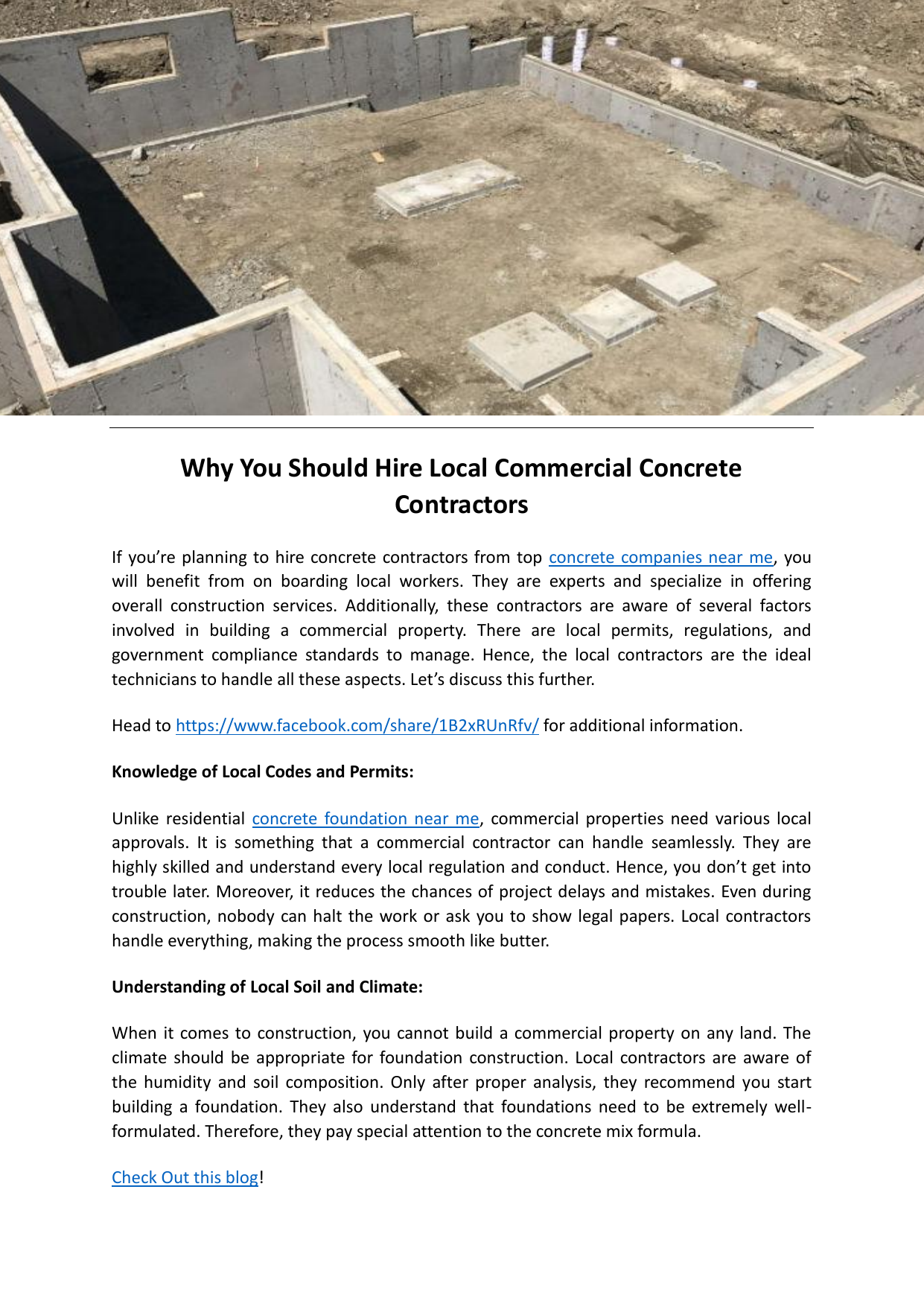 Why You Should Hire Local Commercial Concrete Contractors If you’re planning to hire concrete contractors from top concrete companies near me, you will benefit from on boarding local workers. They are experts and specialize in offering overall construction services. Additionally, these contractors are aware of several factors involved in building a commercial property. There are local permits, regulations, and government compliance standards to manage. Hence, the local contractors are the ideal technicians to handle all these aspects. Let’s discuss this further. Head to https://www.facebook.com/share/1B2xRUnRfv/ for additional information. Knowledge of Local Codes and Permits: Unlike residential concrete foundation near me, commercial properties need various local approvals. It is something that a commercial contractor can handle seamlessly. They are highly skilled and understand every local regulation and conduct. Hence, you don’t get into trouble later. Moreover, it reduces the chances of project delays and mistakes. Even during construction, nobody can halt the work or ask you to show legal papers. Local contractors handle everything, making the process smooth like butter. Understanding of Local Soil and Climate: When it comes to construction, you cannot build a commercial property on any land. The climate should be appropriate for foundation construction. Local contractors are aware of the humidity and soil composition. Only after proper analysis, they recommend you start building a foundation. They also understand that foundations need to be extremely wellformulated. Therefore, they pay special attention to the concrete mix formula. Check Out this blog! Easy Communication: If you settle for a local contractor, they are easily accessible. It means you can contact them right away. Whenever you feel the need to ask a query or solve a construction dilemma, instantly ask them to meet you. It is also easy to coordinate with them on-site and share views. You can also elaborate on construction discussions in relation to the outcomes. This way, you and the contractor can trust each other that the project will be completed on time. For more information, Click Here! So, when in doubt, only reach out to a local commercial contractor for your business property. You cannot compromise on the knowledge of the local land. About K & M Hall Concrete Ltd.: K & M Hall Concrete Ltd. is an excellent company with top-rated basement foundation contractors near me. It can also help transform your old, unused basement into a new property. The contractors also bring decades of training and experience in building concrete properties. So, contact this company right away and get elite services. To get more details, visit https://www.kmhallconcrete.com/ Contact Here: +403 635 1566 Email: [email protected] Original Source: https://bit.ly/3KtAT9e