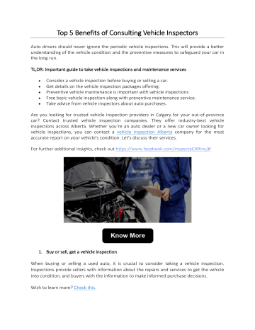 Top 5 Benefits of Consulting Vehicle Inspectors Auto drivers should never ignore the periodic vehicle inspections. This will provide a better understanding of the vehicle condition and the preventive measures to safeguard your car in the long run. TL;DR: Important guide to take vehicle inspections and maintenance services Consider a vehicle inspection before buying or selling a car. Get details on the vehicle inspection packages offering. Preventive vehicle maintenance is important with vehicle inspections Free basic vehicle inspection along with preventive maintenance service. Take advice from vehicle inspectors about auto purchases. Are you looking for trusted vehicle inspection providers in Calgary for your out-of-province car? Contact trusted vehicle inspection companies. They offer industry-best vehicle inspections across Alberta. Whether you’re an auto dealer or a new car owner looking for vehicle inspections, you can contact a vehicle inspection Alberta company for the most accurate report on your vehicle's condition. Let’s discuss their services. For further additional insights, check out https://www.facebook.com/inspectaCARinc/# 1. Buy or sell, get a vehicle inspection. When buying or selling a used auto, it is crucial to consider taking a vehicle inspection. Inspections provide sellers with information about the repairs and services to get the vehicle into condition, and buyers with the information to make informed purchase decisions. Wish to learn more? Check this. 2. Know the types of vehicle inspections. At a vehicle inspection company, you can get distinct inspection assistance, from basic insurance inspections to out-of-province inspections. For pre-purchases, taking their premium pre-purchase evaluation is best, as it covers all the car's interior and exterior checks. And if you operate a fleet of vehicles, then take their dealer inspections. And to know the dealer inspection pricing, you can contact their services directly. 3. Importance of vehicle maintenance services Preventive maintenance is a proactive step to avoid costlier vehicle repairs and engine failures. This vehicle inspection in Calgary alsooffers maintenance services for all types of auto models. From basic versions to the latest high-definition models. Maintenance services include oil and lubrication for engine coolants and transmission fluids. Furthermore, they offer battery maintenance and replacement of engine air filters and cabin air filters. 4. Vehicle inspectors also offer vehicle maintenance services. Every vehicle has an engine, and for the engine to run smoothly, a regular oil change is essential. Reputed vehicle inspection companies offering maintenance packages that start from just 79$ for the basic pack. With their free vehicle inspection services, they add a basic maintenance oil change pack. To connect with trustworthy vehicle inspectors, visit here. 5. Auto purchasing advice When purchasing a used vehicle, there are hidden risks; therefore, consulting an expert is beneficial. Vehicle inspection companies, with their decades of experience, provide advisory support for vehicle purchases. So, get a vehicle inspection from their skilled certified technicians to identify the hidden risks. Without speaking to the vehicle inspector, never purchase a used vehicle; you may lose your investment. It indicates the significance of a vehicle inspector. Whether you're looking for an out of province inspection Calgary or preventive maintenance for your auto? Contact only trusted companies that have good reviews. To get more details, visit https://inspectacar.ca/ Original source: https://bit.ly/4q9rKSS