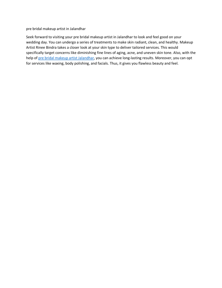 pre bridal makeup artist in Jalandhar Seek forward to visiting your pre bridal makeup artist in Jalandhar to look and feel good on your wedding day. You can undergo a series of treatments to make skin radiant, clean, and healthy. Makeup Artist Rinee Bindra takes a closer look at your skin type to deliver tailored services. This would specifically target concerns like diminishing fine lines of aging, acne, and uneven skin tone. Also, with the help of pre bridal makeup artist Jalandhar, you can achieve long-lasting results. Moreover, you can opt for services like waxing, body polishing, and facials. Thus, it gives you flawless beauty and feel.