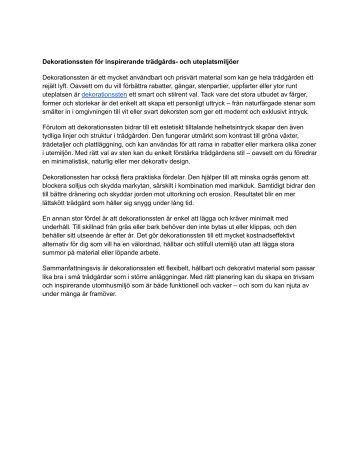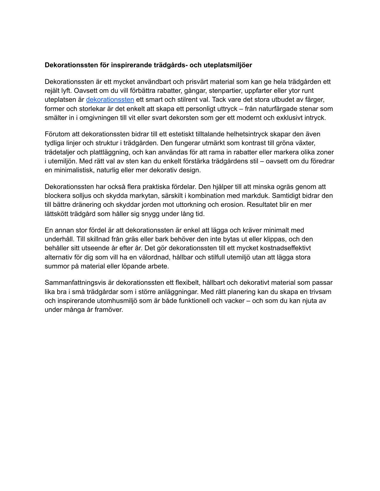 Dekorationssten för inspirerande trädgårds- och uteplatsmiljöer Dekorationssten är ett mycket användbart och prisvärt material som kan ge hela trädgården ett rejält lyft. Oavsett om du vill förbättra rabatter, gångar, stenpartier, uppfarter eller ytor runt uteplatsen är dekorationssten ett smart och stilrent val. Tack vare det stora utbudet av färger, former och storlekar är det enkelt att skapa ett personligt uttryck – från naturfärgade stenar som smälter in i omgivningen till vit eller svart dekorsten som ger ett modernt och exklusivt intryck. Förutom att dekorationssten bidrar till ett estetiskt tilltalande helhetsintryck skapar den även tydliga linjer och struktur i trädgården. Den fungerar utmärkt som kontrast till gröna växter, trädetaljer och plattläggning, och kan användas för att rama in rabatter eller markera olika zoner i utemiljön. Med rätt val av sten kan du enkelt förstärka trädgårdens stil – oavsett om du föredrar en minimalistisk, naturlig eller mer dekorativ design. Dekorationssten har också flera praktiska fördelar. Den hjälper till att minska ogräs genom att blockera solljus och skydda markytan, särskilt i kombination med markduk. Samtidigt bidrar den till bättre dränering och skyddar jorden mot uttorkning och erosion. Resultatet blir en mer lättskött trädgård som håller sig snygg under lång tid. En annan stor fördel är att dekorationssten är enkel att lägga och kräver minimalt med underhåll. Till skillnad från gräs eller bark behöver den inte bytas ut eller klippas, och den behåller sitt utseende år efter år. Det gör dekorationssten till ett mycket kostnadseffektivt alternativ för dig som vill ha en välordnad, hållbar och stilfull utemiljö utan att lägga stora summor på material eller löpande arbete. Sammanfattningsvis är dekorationssten ett flexibelt, hållbart och dekorativt material som passar lika bra i små trädgårdar som i större anläggningar. Med rätt planering kan du skapa en trivsam och inspirerande utomhusmiljö som är både funktionell och vacker – och som du kan njuta av under många år framöver.