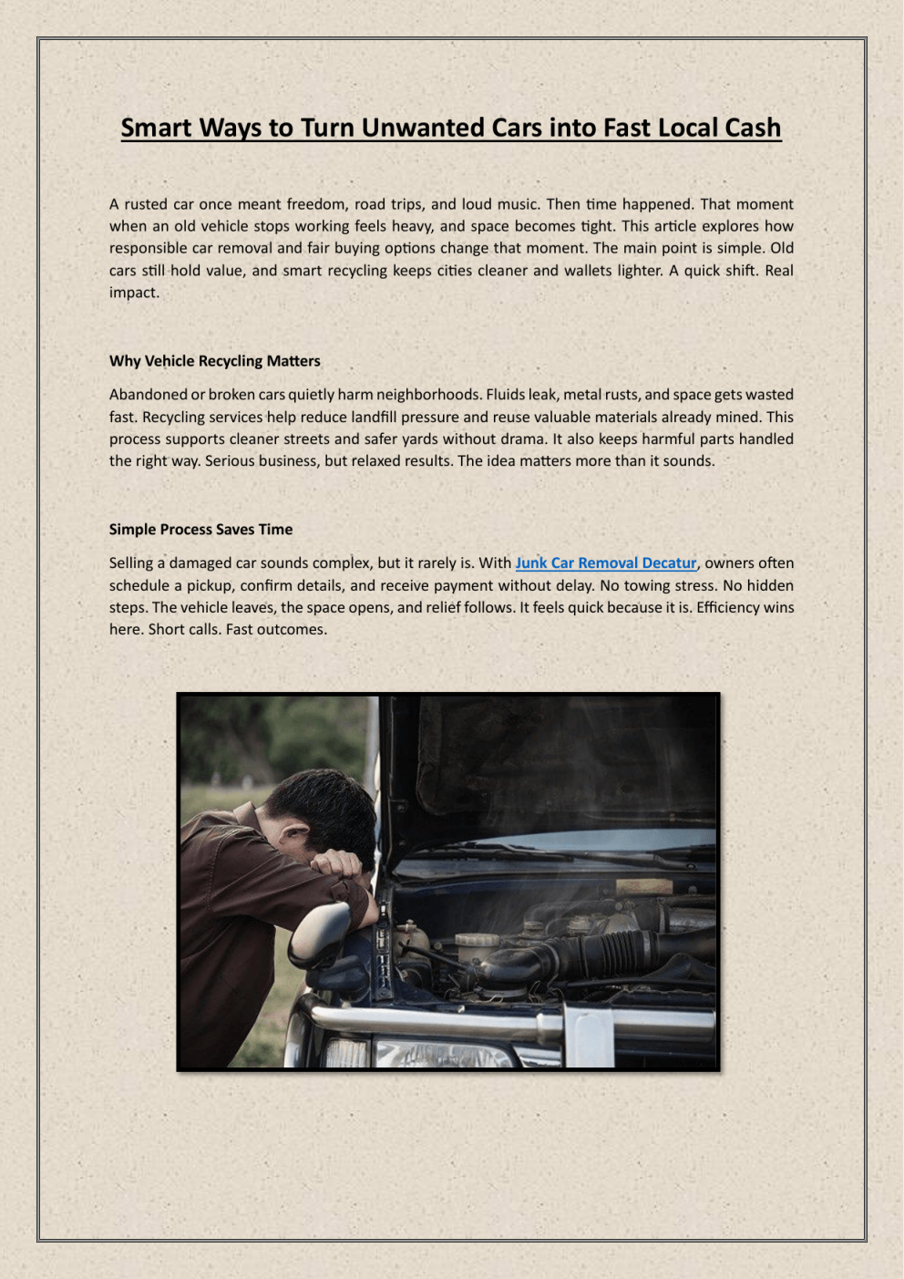 Smart Ways to Turn Unwanted Cars into Fast Local Cash A rusted car once meant freedom, road trips, and loud music. Then time happened. That moment when an old vehicle stops working feels heavy, and space becomes tight. This article explores how responsible car removal and fair buying options change that moment. The main point is simple. Old cars still hold value, and smart recycling keeps cities cleaner and wallets lighter. A quick shift. Real impact. Why Vehicle Recycling Matters Abandoned or broken cars quietly harm neighborhoods. Fluids leak, metal rusts, and space gets wasted fast. Recycling services help reduce landfill pressure and reuse valuable materials already mined. This process supports cleaner streets and safer yards without drama. It also keeps harmful parts handled the right way. Serious business, but relaxed results. The idea matters more than it sounds. Simple Process Saves Time Selling a damaged car sounds complex, but it rarely is. With Junk Car Removal Decatur, owners often schedule a pickup, confirm details, and receive payment without delay. No towing stress. No hidden steps. The vehicle leaves, the space opens, and relief follows. It feels quick because it is. Efficiency wins here. Short calls. Fast outcomes. Local Markets Create Value Different towns value cars differently, based on demand and parts reuse. Cash For Cars Woodstock reflects this local approach by pricing vehicles fairly, even when they look done. At the same time, Junk Car Removal Decatur helps clear unused vehicles that block driveways and minds. Local knowledge matters. Money moves. Cars move faster. A practical exchange happens quietly. Choosing Trusted Recycling Services Trust matters when paperwork and payment are involved. Services like Cash for Cars Woodstock focus on clear communication and quick decisions. Meanwhile, Junk Car Removal Decatur supports ecofriendly handling that meets regulations without fuss. Reliability shows in small actions. Calls returned. Payments delivered. No long waits. Professional tone, casual experience. It feels balanced. Almost too easy. Conclusion Letting go of an old vehicle opens space and brings unexpected cash. Recycling protects the environment while supporting local economies. Decisions feel lighter when handled simply, without pressure. kimbrorecycling.com reflects a recycling-first mindset, fair pricing, and smooth service flow. It supports responsible car disposal and smart reuse of materials. Choosing informed options leads to cleaner communities and better outcomes. Old cars end. New value begins. Quietly effective.