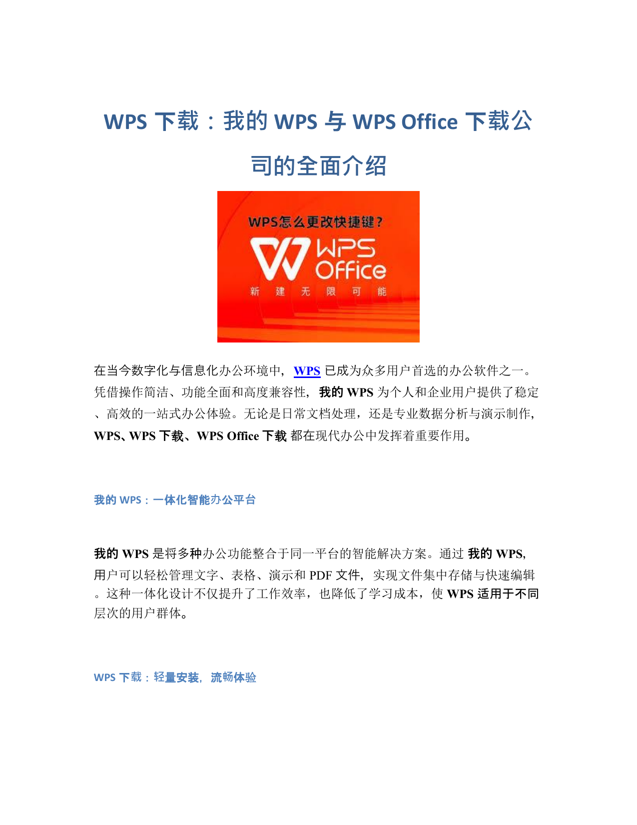 WPS 下载:我的 WPS 与 WPS Office 下载公 司的全面介绍 在当今数字化与信息化办公环境中,WPS 已成为众多用户首选的办公软件之一。 凭借操作简洁、功能全面和高度兼容性,我的 WPS 为个人和企业用户提供了稳定 、高效的一站式办公体验。无论是日常文档处理,还是专业数据分析与演示制作, WPS、WPS 下载、WPS Office 下载 都在现代办公中发挥着重要作用。 我的 WPS:一体化智能办公平台 我的 WPS 是将多种办公功能整合于同一平台的智能解决方案。通过 我的 WPS, 用户可以轻松管理文字、表格、演示和 PDF 文件,实现文件集中存储与快速编辑 。这种一体化设计不仅提升了工作效率,也降低了学习成本,使 WPS 适用于不同 层次的用户群体。 WPS 下载:轻量安装,流畅体验 在众多办公软件中,WPS 下载 以轻量化和高性能著称。相比传统办公软件,WPS 下载 安装速度快、占用系统资源少,即使在配置较低的设备上也能稳定运行。同时 ,WPS 下载 注重数据安全,支持文档加密、权限设置与云端备份,为用户的重要 文件提供多重保障。 WPS Office 下载公司:专业与信赖的象征 作为专业的 WPS Office 下载公司,WPS 长期专注于办公软件的研发与优化。通过 不断升级产品功能和服务体系,WPS Office 下载公司 确保软件在兼容性、安全性 和稳定性方面始终保持高水准。选择 WPS、WPS 下载、WPS Office 下载,不仅是 选择一款工具,更是选择一个值得信赖的办公品牌。 WPS Office 下载的核心功能优势 WPS Office 下载 提供完整而实用的办公功能。文字处理功能支持多格式编辑与专 业排版;表格工具具备丰富函数,满足数据分析需求;演示模块模板多样,适合商 务汇报和教学展示;同时内置 PDF 阅读、编辑与转换功能,使 WPS Office 下载 成为真正的全能办公助手。 多场景适用的 WPS 办公方案 无论是学生完成学习任务,职场人士处理工作文件,还是企业进行团队协作, WPS、WPS 下载、WPS Office 下载 都能提供灵活的解决方案。我的 WPS 支持多 平台同步,覆盖电脑与移动设备,让用户随时随地高效办公,充分适应现代移动办 公趋势。 持续进化的 WPS 办公体验 随着办公需求的不断升级,WPS Office 下载公司 持续推动产品创新,引入云服务 和智能功能,不断优化 WPS 下载 的使用体验。通过持续更新,WPS 正在构建更 加智能、高效的未来办公生态。 结论 综上所述,WPS、WPS 下载、WPS Office 下载 凭借强大的功能体系、便捷的使用 方式以及专业可靠的 WPS Office 下载公司 支持,已成为现代办公的重要选择。无 论是使用 我的 WPS 进行个人学习,还是通过 WPS 下载 和 WPS Office 下载 实现 企业高效协作,WPS 都能为用户带来稳定、智能且高性价比的办公体验。查看更 多信息 WPS 下载, WPS office 下载