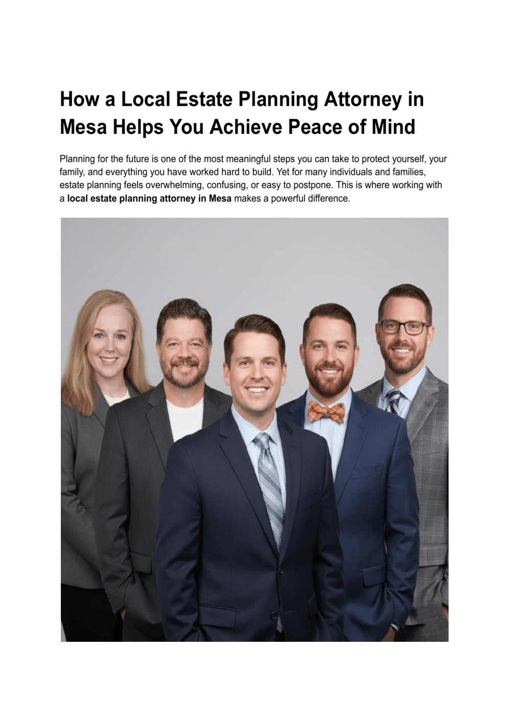 How a Local Estate Planning Attorney in Mesa Helps You Achieve Peace of Mind Planning for the future is one of the most meaningful steps you can take to protect yourself, your family, and everything you have worked hard to build. Yet for many individuals and families, estate planning feels overwhelming, confusing, or easy to postpone. This is where working with a local estate planning attorney in Mesa makes a powerful difference. A knowledgeable estate planning attorney does more than draft documents. They provide clarity, confidence, and long-term security. Most importantly, they help you achieve peace of mind, knowing your wishes are protected, and your loved ones are cared for, no matter what the future holds. In this comprehensive guide, we explain how a local estate planning attorney in Mesa helps you achieve peace of mind, why local experience matters, and how proper estate planning protects you during your lifetime and beyond. What Estate Planning Really Means Estate planning is often misunderstood as something only needed at the end of life. In reality, it is a proactive legal strategy that protects you at every stage of adulthood. A Broader Definition of Estate Planning Estate planning includes: ● ● ● ● ● Deciding how your assets are managed and distributed Planning for medical emergencies and incapacity Protecting minor children and dependents Minimizing taxes, court involvement, and family disputes Preserving your values and legacy A Mesa estate planning attorney ensures that all these elements work together seamlessly. Why Estate Planning Equals Peace of Mind Peace of mind comes from knowing: ● ● ● ● Your family will not struggle with uncertainty Courts will not make decisions for you Your assets will go to the people you choose Your healthcare wishes will be respected Estate planning replaces fear of the unknown with confidence and control. Why Working With a Local Estate Planning Attorney in Mesa Matters Choosing a local attorney is one of the most important decisions you can make in the estate planning process. Knowledge of Arizona Estate Planning Laws Arizona has specific laws governing: ● ● ● ● Probate and trust administration Community property rules Healthcare directives and powers of attorney Guardianship and conservatorship A local estate planning attorney in Mesa understands how these laws apply to your situation and keeps your plan legally compliant. Understanding the Mesa Community and Local Courts Local attorneys: ● ● ● ● Know how Maricopa County courts operate Understand local real estate and property considerations Are familiar with regional family dynamics and business structures Offer accessible, face-to-face guidance This local insight allows for more accurate, practical planning. How a Mesa Estate Planning Attorney Helps You Take Control of Your Future Estate planning is about control. Without a plan, state law steps in and makes decisions for you. Creating a Customized Estate Plan A local estate planning attorney in Mesa: ● ● ● ● Listens to your goals and concerns Evaluates your assets and family structure Designs a plan tailored specifically to you Avoids generic, one-size-fits-all solutions This customization ensures your wishes are honored exactly as intended. Replacing Uncertainty With Clarity Clients often feel overwhelmed by legal terminology and options. Your attorney explains: ● What each document does ● Why certain strategies are recommended ● How your plan works in real-life situations Understanding your plan creates confidence and peace of mind. Essential Estate Planning Documents That Provide Peace of Mind A complete estate plan includes several critical documents, each serving a specific purpose. Wills: The Foundation of Your Estate Plan A will allows you to: ● ● ● ● Name beneficiaries Appoint guardians for minor children Choose an executor Provide clear instructions for asset distribution A Mesa estate planning attorney ensures your will meets Arizona legal requirements and avoids costly errors. Trusts: Privacy, Control, and Probate Avoidance Many Mesa residents choose trusts for greater control and flexibility. Benefits of Trust-Based Planning Trusts can: ● ● ● ● Avoid probate Protect privacy Manage assets during incapacity Control how and when beneficiaries receive inheritances A local estate planning attorney in Mesa helps determine whether a revocable or irrevocable trust is right for you. Powers of Attorney: Protection During Incapacity Incapacity planning is essential for peace of mind. Financial Power of Attorney This document allows someone you trust to: ● Pay bills ● Manage investments ● Handle legal matters Healthcare Power of Attorney This document ensures: ● Medical decisions are made by someone you trust ● Your wishes are respected if you cannot communicate Without these documents, families often face court intervention. Advance Healthcare Directives An advance directive allows you to: ● Outline end-of-life preferences ● Address life support and treatment decisions ● Reduce emotional stress for loved ones A Mesa estate planning attorney ensures your directives are clear and enforceable. How Estate Planning Protects Your Family and Loved Ones Peace of mind often comes from knowing your family is protected. Guardianship Planning for Minor Children Parents in Mesa must plan for the unthinkable. Without guardianship designations: ● Courts decide who raises your children ● Family conflicts may arise ● Delays and uncertainty increase A local estate planning attorney helps parents: ● Choose guardians wisely ● Name backup guardians ● Provide financial security through trusts Preventing Family Conflict and Disputes Clear estate plans reduce misunderstandings. An estate planning attorney in Mesa: ● Anticipates potential disputes ● Uses precise legal language ● Structures distributions thoughtfully This proactive approach protects family relati