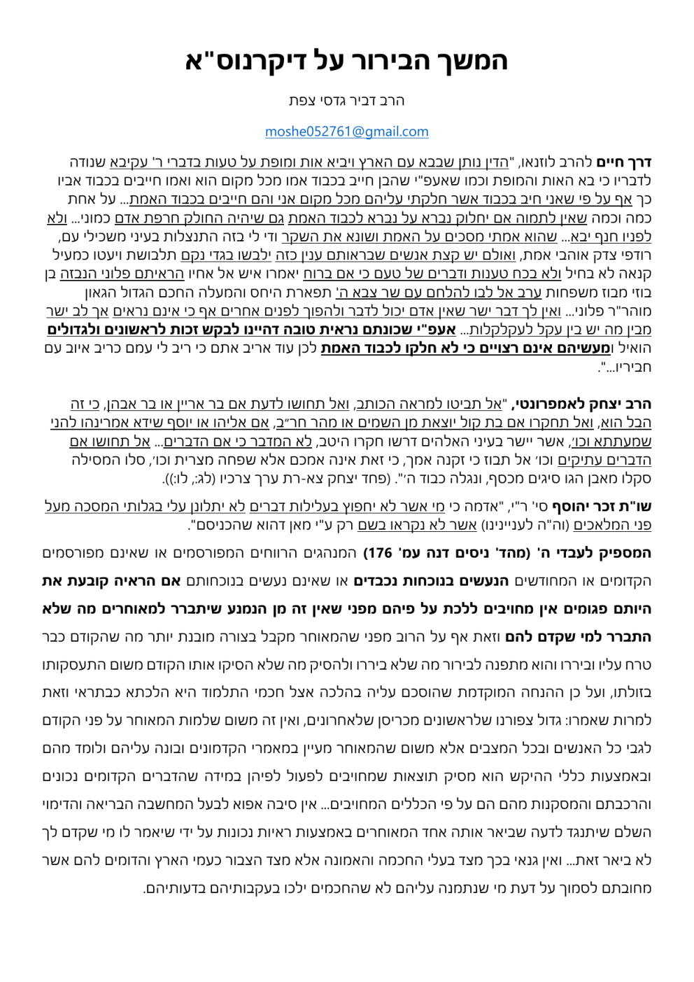 המשך הבירור על דיקרנוס"א הרב דביר גדסי צפת [email protected] דרך חיים להרב לוזנאו" ,הדין נותן שבבא עם הארץ ויביא אות ומופת על טעות בדברי ר' עקיבא שנודה לדבריו כי בא האות והמופת וכמו שאעפ"י שהבן חייב בכבוד אמו מכל מקום הוא ואמו חייבים בכבוד אביו כך אף על פי שאני חיב בכבוד אשר חלקתי עליהם מכל מקום אני והם חייבים בכבוד האמת ...על אחת כמה וכמה שאין לתמוה אם יחלוק נברא על נברא לכבוד האמת גם שיהיה החולק חרפת אדם כמוני ...ולא לפניו חנף יבא ...שהוא אמתי מסכים על האמת ושונא את השקר ודי לי בזה התנצלות בעיני משכילי עם, רודפי צדק אוהבי אמת ,ואולם יש קצת אנשים שבראותם ענין כזה ילבשו בגדי נקם תלבושת ויעטו כמעיל קנאה לא בחיל ולא בכח טענות ודברים של טעם כי אם ברוח יאמרו איש אל אחיו הראיתם פלוני הנבזה בן בוזי מבוז משפחות ערב אל לבו להלחם עם שר צבא ה' תפארת היחס והמעלה החכם הגדול הגאון מוהר"ר פלוני ...ואין לך דבר ישר שאין אדם יכול לדבר ולהפוך לפנים אחרים אף כי אינם נראים אך לב ישר מבין מה יש בין עקל לעקלקלות ...אעפ"י שכונתם נראית טובה דהיינו לבקש זכות לראשונים ולגדולים הואיל ומעשיהם אינם רצויים כי לא חלקו לכבוד האמת לכן עוד אריב אתם כי ריב לי עמם כריב איוב עם חביריו."... הרב יצחק לאמפרונטי" ,אל תביטו למראה הכותב ,ואל תחושו לדעת אם בר אריין או בר אבהן ,כי זה הבל הוא ,ואל תחקרו אם בת קול יוצאת מן השמים או מהר חר״ב ,אם אליהו או יוסף שידא אמרינהו להני שמעתתא וכו׳ ,אשר יישר בעיני האלהים דרשו חקרו היטב ,לא המדבר כי אם הדברים ...אל תחושו אם הדברים עתיקים וכו׳ אל תבוז כי זקנה אמך ,כי זאת אינה אמכם אלא שפחה מצרית וכו׳ ,סלו המסילה סקלו מאבן הגו סיגים מכסף ,ונגלה כבוד ה׳"( .פחד יצחק צא-רת ערך צרכיו (לג ,:לו.)): שו"ת זכר יהוסף סי' ר"י" ,אדמה כי מי אשר לא יחפוץ בעלילות דברים לא יתלונן עלי בגלותי המסכה מעל פני המלאכים (וה"ה לעניינינו) אשר לא נקראו בשם רק ע"י מאן דהוא שהכניסם". המספיק לעבדי ה' (מהד' ניסים דנה עמ' )176המנהגים הרווחים המפורסמים או שאינם מפורסמים הקדומים או המחודשים הנעשים בנוכחות נכבדים או שאינם נעשים בנוכחותם אם הראיה קובעת את היותם פגומים אין מחויבים ללכת על פיהם מפני שאין זה מן הנמנע שיתברר למאוחרים מה שלא התברר למי שקדם להם וזאת אף על הרוב מפני שהמאוחר מקבל בצורה מובנת יותר מה שהקודם כבר טרח עליו וביררו והוא מתפנה לבירור מה שלא ביררו ולהסיק מה שלא הסיקו אותו הקודם משום התעסקותו בזולתו ,ועל כן ההנחה המוקדמת שהוסכם עליה בהלכה אצל חכמי התלמוד היא הלכתא כבתראי וזאת למרות שאמרו :גדול צפורנו שלראשונים מכריסן שלאחרונים ,ואין זה משום שלמות המאוחר על פני הקודם לגבי כל האנשים ובכל המצבים אלא משום שהמאוחר מעיין במאמרי הקדמונים ובונה עליהם ולומד מהם ובאמצעות כללי ההיקש הוא מסיק תוצאות שמחויבים לפעול לפיהן במידה שהדברים הקדומים נכונים והרכבתם והמסקנות מהם הם על פי הכללים המחויבים ...אין סיבה אפוא לבעל המחשבה הבריאה והדימוי השלם שיתנגד לדעה שביאר אותה אחד המאוחרים באמצעות ראיות נכונות על ידי שיאמר לו מי שקדם לך לא ביאר זאת ...ואין גנאי בכך מצד בעלי החכמה והאמונה אלא מצד הצבור כעמי הארץ והדומים להם אשר מחובתם לסמוך על דעת מי שנתמנה עליהם לא שהחכמים ילכו בעקבותיהם בדעותיהם. המאירי חולין ז" :תלמיד חכם שאמר דבר הלכה מחודשת הן דרך הוראה הן דרך גדר הן להחמיר הן להקל, אעפ"י שהוא מבטל בזה מנהג קדמונים ,אין ראוי להחזיקו בכך במדת יוהרא ונטילת שם במה שאין ראוי לו לסרב בדבריו מצד שלא נהגו הקדמונים כן אחר שהוא מראה פנים לדבריו ,ושהוא כדאי לסמוך עליו שכל תלמיד ותלמיד מקום הונח לו להתגדר בו ,וזהו שאמרו ברבנו הקדוש כשהתיר את בית שאן חברו עליו אחיו ובית אביו אמרו לו מקום שאבותיך ואבות אבותיך נהגו בו איסור אתה תנהג בו היתר דרש להם מה שנאמר בחזקיה וכתת את נחש הנחשת ...אפשר בא אסא ולא ביערו ...אלא מקום הניחו לו ...מכאן לתלמיד חכם שאמר דבר הלכה שאין מזיחין אותו ר"ל ש