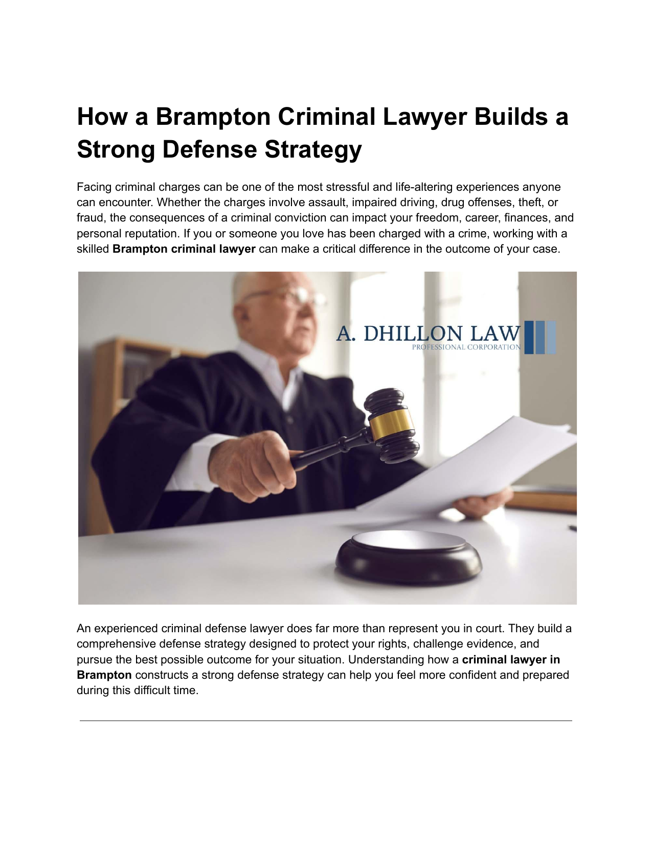 How a Brampton Criminal Lawyer Builds a Strong Defense Strategy Facing criminal charges can be one of the most stressful and life-altering experiences anyone can encounter. Whether the charges involve assault, impaired driving, drug offenses, theft, or fraud, the consequences of a criminal conviction can impact your freedom, career, finances, and personal reputation. If you or someone you love has been charged with a crime, working with a skilled Brampton criminal lawyer can make a critical difference in the outcome of your case. An experienced criminal defense lawyer does far more than represent you in court. They build a comprehensive defense strategy designed to protect your rights, challenge evidence, and pursue the best possible outcome for your situation. Understanding how a criminal lawyer in Brampton constructs a strong defense strategy can help you feel more confident and prepared during this difficult time. Understanding the Importance of a Strong Criminal Defense Strategy A criminal defense strategy is a carefully planned legal approach used to challenge allegations, protect constitutional rights, and minimize legal consequences. Every criminal case is unique, requiring a customized plan based on evidence, legal procedures, and individual circumstances. Why a Strategic Defense Matters A strong defense strategy can: ● ● ● ● ● Protect you from wrongful conviction Reduce or dismiss charges Minimize penalties or sentencing Challenge unlawful police conduct Safeguard your future employment and reputation Without a strategic legal approach, individuals often face severe penalties, including fines, probation, or imprisonment. A knowledgeable Brampton criminal defense lawyer evaluates every aspect of your case to ensure that your rights are fully protected. The Role of a Brampton Criminal Lawyer in Your Case Criminal defense lawyers serve as legal advocates who guide clients through complex legal processes. Their responsibilities extend beyond courtroom representation. Legal Guidance and Case Assessment A criminal lawyer in Brampton begins by carefully reviewing your case. This includes evaluating charges, analyzing evidence, and identifying potential legal defenses. Early legal involvement is essential because mistakes made during the investigation or arrest process can significantly affect the case outcome. Protecting Constitutional Rights Canadian law guarantees fundamental rights for individuals accused of crimes. These rights include protection against unlawful searches, the right to remain silent, and access to legal representation. A skilled lawyer ensures that law enforcement agencies respect these rights. Step-by-Step Process: How a Brampton Criminal Lawyer Builds a Defense Strategy Developing an effective defense strategy requires careful planning, legal knowledge, and investigative skills. Below is a detailed look at how experienced criminal lawyers build strong cases. Initial Client Consultation and Case Evaluation The first step involves meeting with the client to understand the details of the case. During this consultation, the lawyer gathers important information, including: ● ● ● ● ● Details of the arrest Police interactions and statements Witness accounts Timeline of events Previous legal history This initial evaluation helps the lawyer determine potential defense options and identify weaknesses in the prosecution’s case. Conducting a Detailed Investigation A strong criminal defense strategy relies heavily on independent investigation. A Brampton criminal lawyer does not rely solely on police reports. Instead, they conduct their own analysis of the case. Gathering Evidence Lawyers review evidence such as: ● ● ● ● ● Surveillance footage Police reports Forensic evidence Digital communications Medical records Interviewing Witnesses Witness testimony can significantly influence the outcome of a criminal case. Lawyers interview witnesses to verify statements, identify inconsistencies, and uncover additional details. Working with Expert Witnesses In complex cases, criminal lawyers may collaborate with forensic experts, medical professionals, or accident reconstruction specialists to strengthen the defense. Analyzing the Prosecution’s Evidence One of the most important aspects of criminal defense is evaluating the evidence presented by the prosecution. The burden of proof rests on the Crown prosecutor, who must prove guilt beyond a reasonable doubt. A skilled criminal lawyer in Brampton carefully examines: ● ● ● ● ● Evidence authenticity Witness credibility Police procedures Chain of custody Potential constitutional violations If evidence was obtained unlawfully, the lawyer can request its exclusion from court, which may significantly weaken the prosecution’s case. Identifying Legal Defenses Every criminal case involves unique legal defense options. A Brampton criminal defense lawyer evaluates various defense strategies based on evidence and circumstances. Lack of Evidence If the prosecution cannot prove the charges beyond a reasonable doubt, the defense lawyer can argue for dismissal. Mistaken Identity In cases involving eyewitness testimony, lawyers may challenge identification reliability. Self-Defense Self-defense is commonly used in assault cases when the accused acted to protect themselves or others. Charter Rights Violations If police violated your rights during arrest, search, or questioning, the lawyer can challenge the admissibility of evidence. Understanding the Local Brampton Court System Local knowledge plays a significant role in criminal defense success. A criminal lawyer in Brampton understands local court procedures, prosecutors, and judicial expectations. This familiarity allows lawyers to develop strategies tailored to the specific court environment. Advantages of Hiring a Local Criminal Lawyer ● ● ● ● Knowledge of local judges and prosecutors Understanding of court procedures and timelines Access to lo